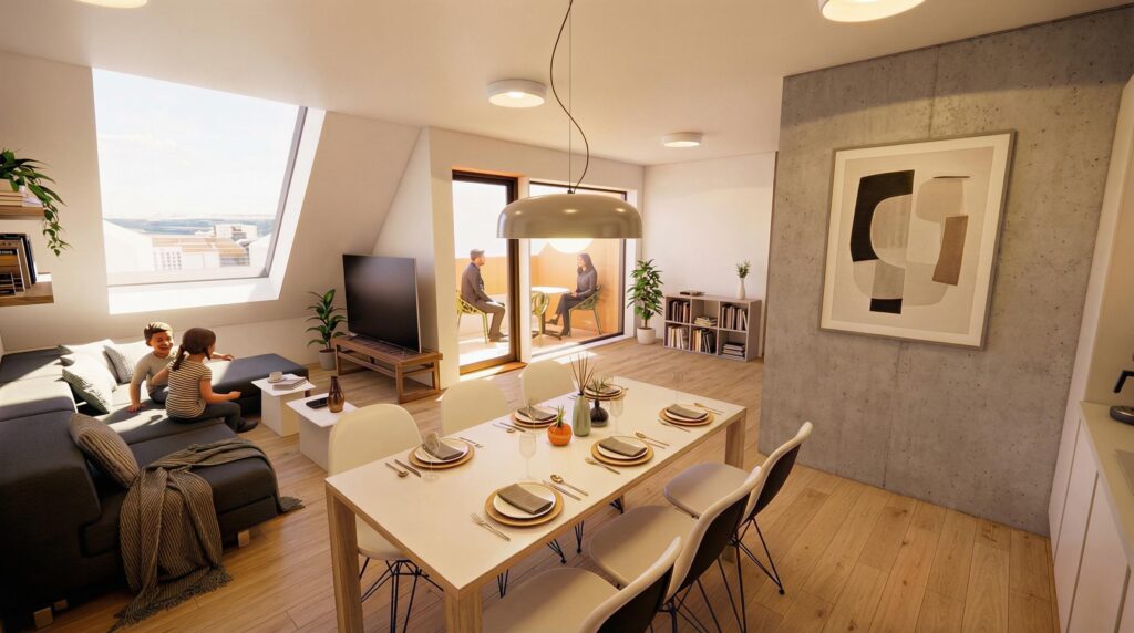 En romslig og gjennomgående 4-roms leilighet med fleksibel planløsning, tre gode soverom og en stor, sosial stue/kjøkken-sone. Den sørvendte balkongen gir rikelig med lys og en flott uteplass for familien.